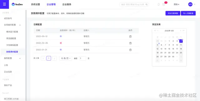 最后,在公司或团队整体上,企业管理员可以在管理后台,设置自己的放假调休时间(YesDev已经自动提供了最新的国家节假日放假时间)。