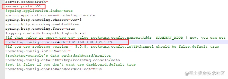 首先是端口号,随意填写,不要被其它程序占用了即可,然后配置NameServer的地址,我们需要将该应用也注册到NameServer中才能够查询Broker的信息。