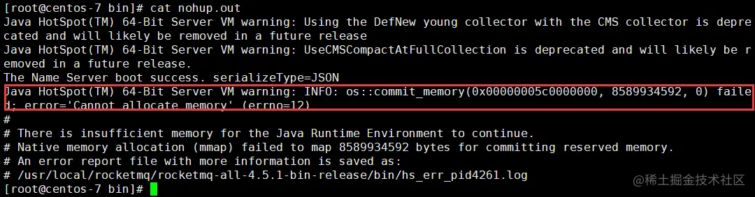 并没有发现Broker的日志文件,我们猜测应该是启动失败了,查看bin目录下的nohup.out文件:
