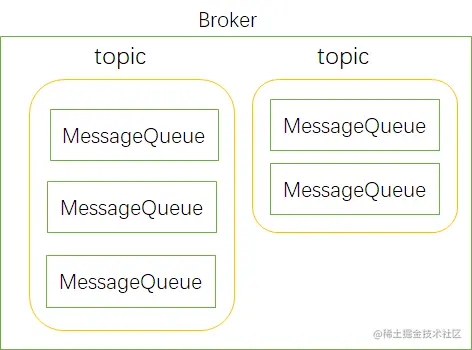 首先消息生产者会向NameServer中获取Broker,所以在这之前我们就要将Broker注册到NameServer中,获取到Broker以后,就可以生产消息并交由Broker存储,Broker内部由MessageQueue存储消息,而MessageQueue又会被逻辑划分为一个一个的topic,结构如下: