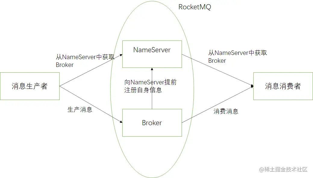 RocketMQ架构中分为消息生产者和消息消费者,生产者生产消息放入RocketMQ,消费者从RocketMQ中取出消息进行消费。RocketMQ中的Broker是其核心组件,用于消息的接收、存储和投递,而NameServer是用来管理Broker的。