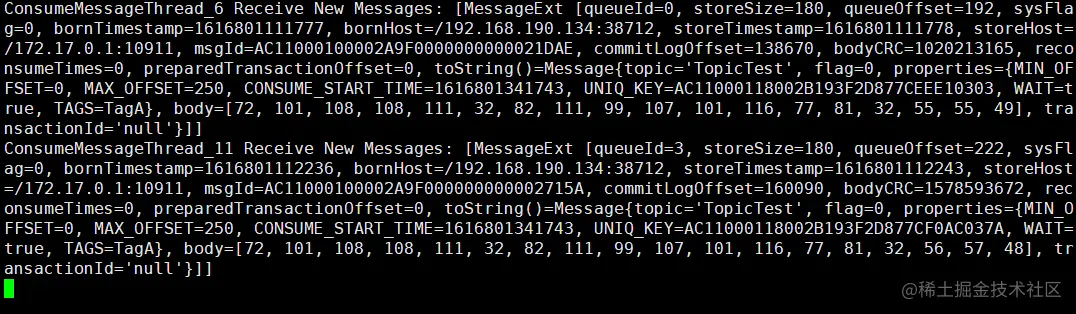 接收到的消息:[MessageExt [queueId=0, storeSize=170, queueOffset=0, sysFlag=0, bornTimestamp=1616861755457, bornHost=/192.168.190.1:65330, storeTimestamp=1616890518525, storeHost=/192.168.190.134:10911, msgId=C0A8BE8600002A9F000000000002BEB2, commitLogOffset=179890, bodyCRC=475410043, reconsumeTimes=0, preparedTransactionOffset=0, toString()=Message{topic='myTopic', flag=0, properties={MIN_OFFSET=0, MAX_OFFSET=1, CONSUME_START_TIME=1616862486130, UNIQ_KEY=AC1221A12EB418B4AAC28B1A483F0000, WAIT=true, TAGS=myTag}, body=[109, 121, 77, 101, 115, 115, 97, 103, 101], transactionId='null'}]]