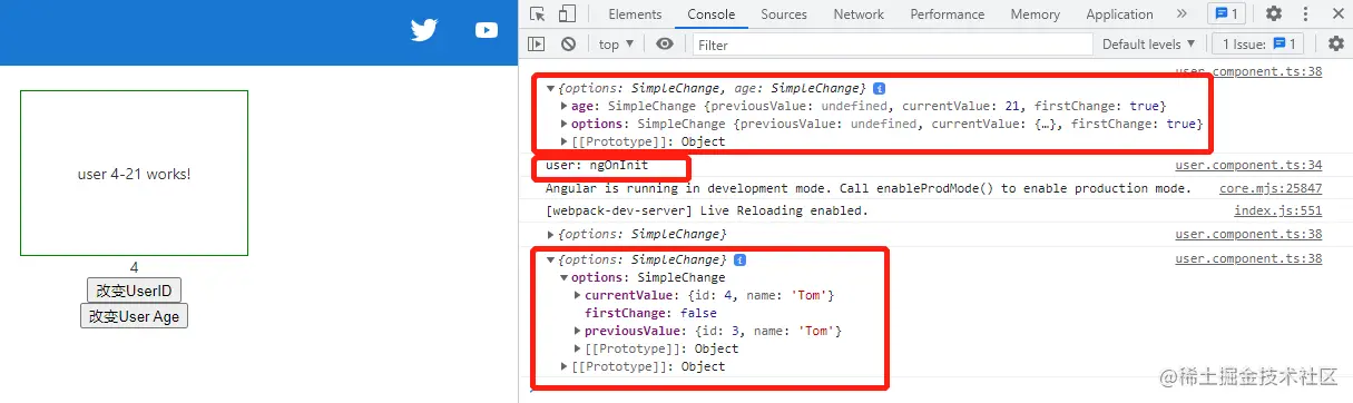 注意父组件里,要改变userInfo的引用,setter才能监听的到。虽然功能是实现了,但是如果我多个输入属性,那每个输入属性都需要实现setter,好麻烦啊,有没有好的办法啊,肯定是有的。先来了解一下组件生命周期函数ngOnChanges。