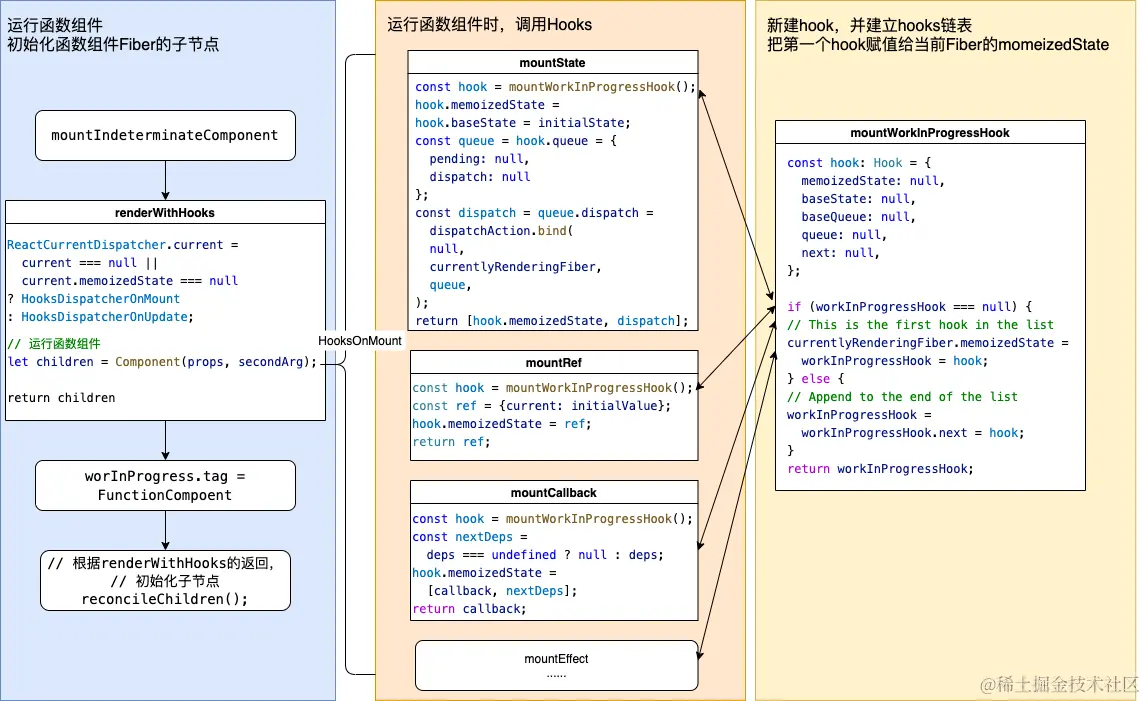 - 调用hooks后生成的hooks链表,会存储在Fiber.memoizedState里,方便取用。