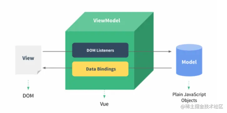 - MVVM通过 数据双向绑定 让数据自动的双向同步,不在需要操作DOM