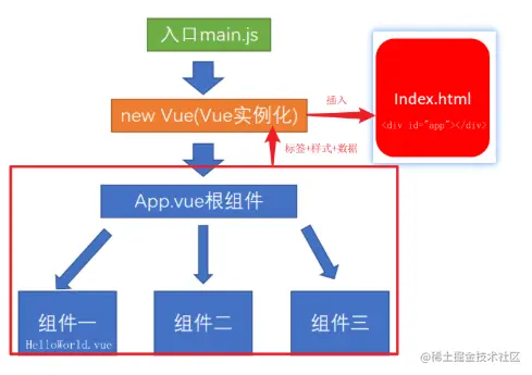 - main.js ==> App.vue ==> index.html