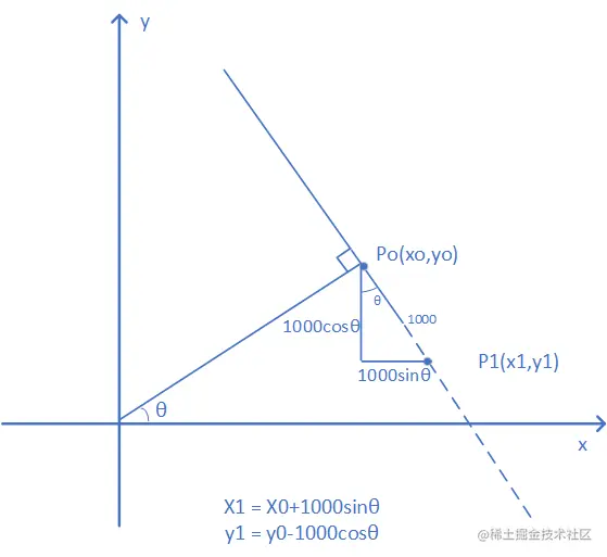 那上述代码该怎么理解呢?现已知(r,θ),其在程序中表现为r = rho = lines[i][0] , θ = theta = lines[i][1] 。那么 x0 = a * rho, y0 = b * rho为直线上该点在直角坐标系下坐标。【这一点由上一篇霍夫检测原理中图5得出】1000的目的是为了将线段延长。以(x0,y0)为基础进行延长。(x0 - 1000 * (-b))可以理解为(x0+1000*b)其中(1000*b)为该p0沿着直线方向延长1000后的点p1距离p0在x方向的距离,那么【x0+1000*b】即为p1的横坐标。为了方便大家理解,作了示意图如下: