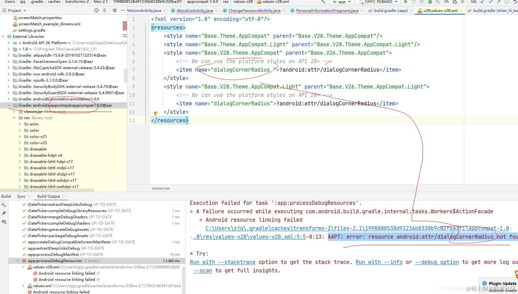 AAPT: error: resource android:attr/dialogCornerRadius not found.