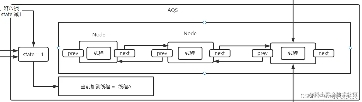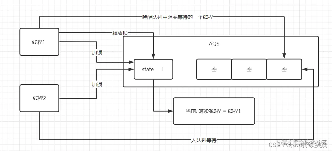 - 线程1 加锁的时候, aqs会去判断state 是否为0 , 如果是0 , 代表没有线程加锁, 则线程1可以加锁, state变量进行cas操作给加1, 并且会维护当前加锁的线程为1. 如果线程1 重复加锁, 则state会累加1.