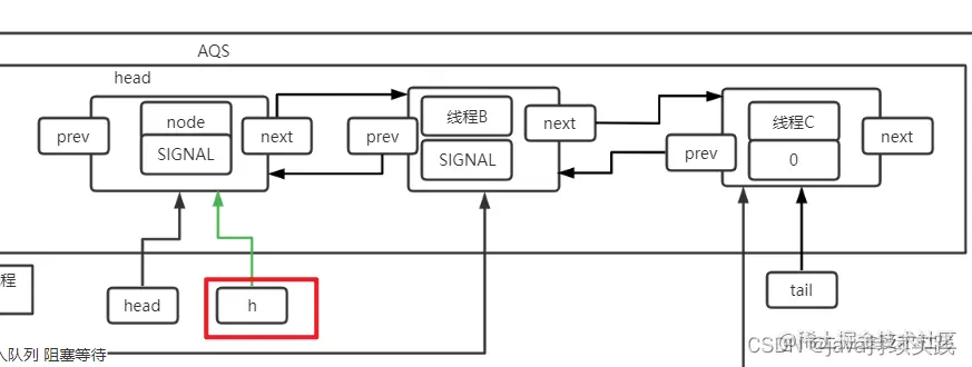 Node h = head;是获取当前队列中的头节点, 并把值给h. 即如下图这一步