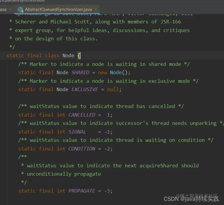 AbstractQueuedSynchronizer的核心主要是node, 自定义的一个内部类, 双向链表(实现的一个阻塞等待队列), state用于实现加锁, 释放锁.