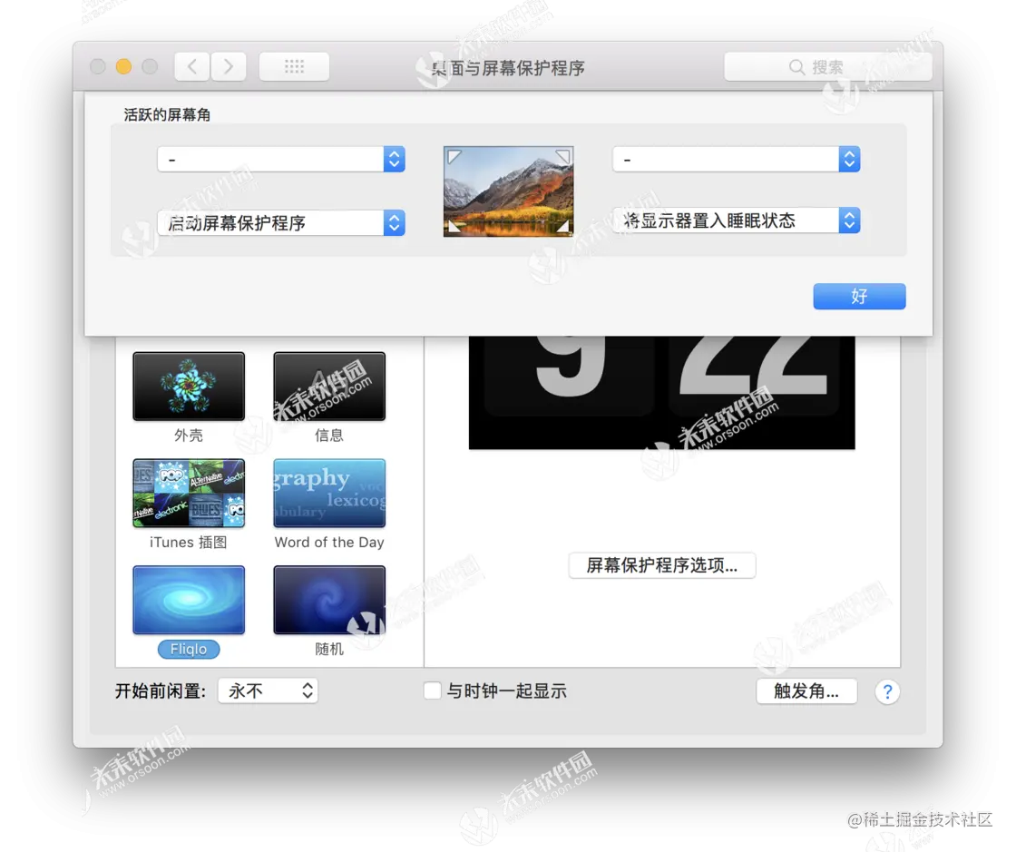 在这里,你可以将四个触发角设置成你用起来最顺手的状态。比如上图我的设置,当在公众场合,我想把屏幕内容暂时屏蔽不让他人看到时,我可以轻松地把光标滑向左下角来进入屏幕保护程序。值得一提的是,当你在进行拖拽等光标在忙的操作时,触发角的功能不会被触发,非常人性化。