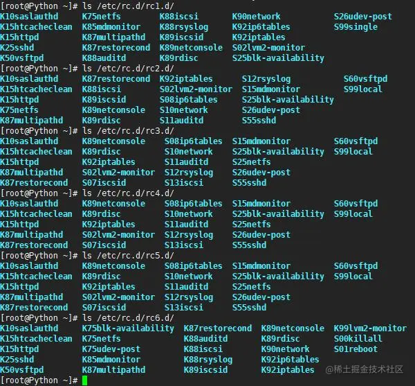 - 在/etc/rc.d/rcN.d文件夹中,可以分别查看各个运行级别的相对应的文件: