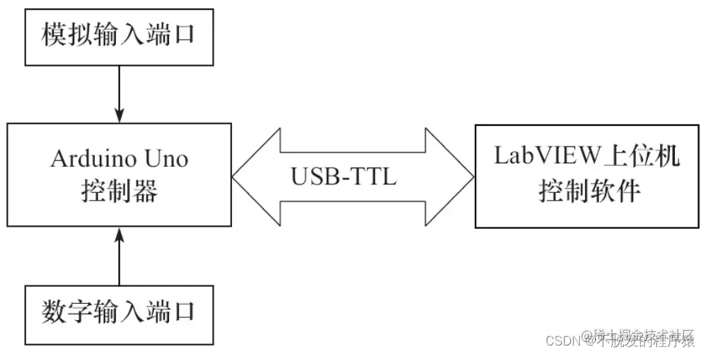 采用Arduino Uno与LabVIEW来实现低成本上下位机数据采集系统,具有模拟量和数字量两种采集功能,可以满足低速、低成本的数据采集需求。其中,Arduino Uno作为下位机,负责A/D转换以及数据传输,LabVIEW编写的数据采集软件作为上位机,上下位机通过USB-TTL接口实现通信。如下图所示为多路数据采集系统框图。