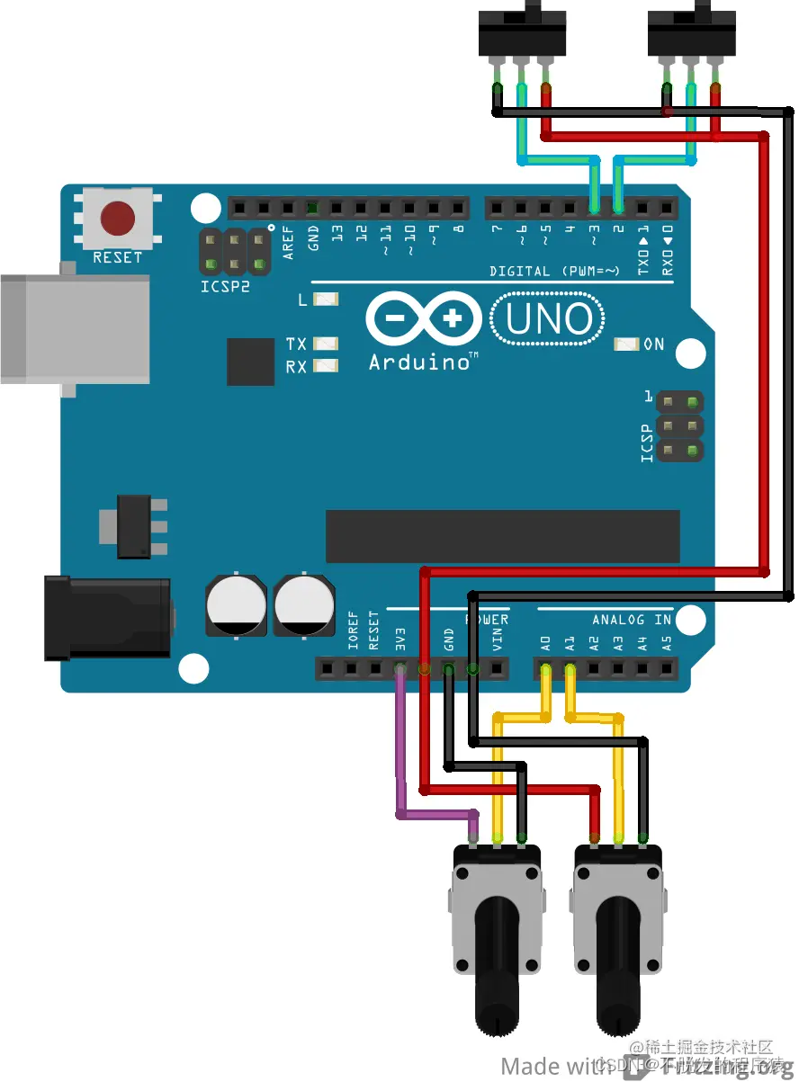 数据采集系统中的Arduino下位机部分采用Arduino Uno控制器,模拟量采用电位器分压来实现不同电压值,数字量采用拨动开关在5V和GND之间切换实现高电平与低电平。多路数据采集系统硬件连接如下图所示: