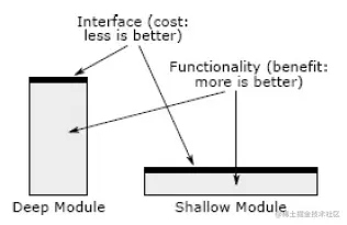 - 符合深模块的软件设计理念。其认为最好的模块提供了强大的功能,又有着简单的接口。试想每个模块由一个长方形表示,如下图,长方形的面积大小和模块实现的功能多少成比例。顶部边代表模块的接口,边的长度代表它的复杂度。最好的模块是深的:他们有很多功能隐藏在简单的接口后。深模块是好的抽象,因为它只把自己内部的一小部分复杂度暴露给了用户。