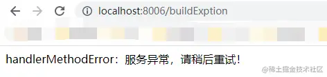 我们再次访问http://localhost:8006/buildExption后,这个时候我们来看一下如果超过阈值之后使用的处理方法是否是我们的SentinelExptioinHandler.handlerMethodError(),当我们频繁的访问地址,就会看到出现了我们在异常处理类中设置的方法。
