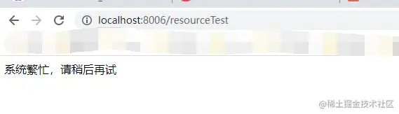 再去快速的去访问http://localhost:8006/resourceTest 就会出现我们在代码中配置的限流异常处理信息,如下图所示: