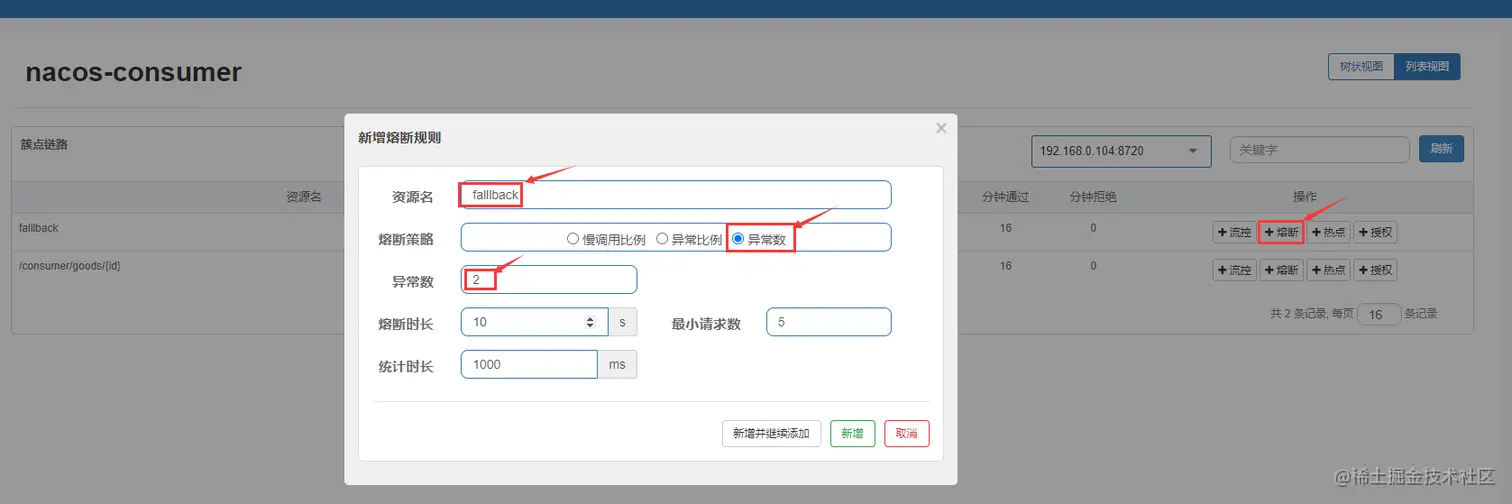 添加熔断规则,在一秒内最小请求次数为5,如果异常超过2个时,触发熔断规则。