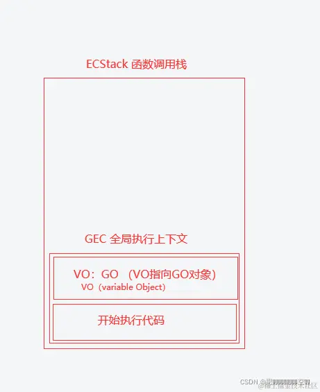 - 代码执行前,全局上下文(GEC中的vo指向go对象)进入执行上下文栈 (ECS)