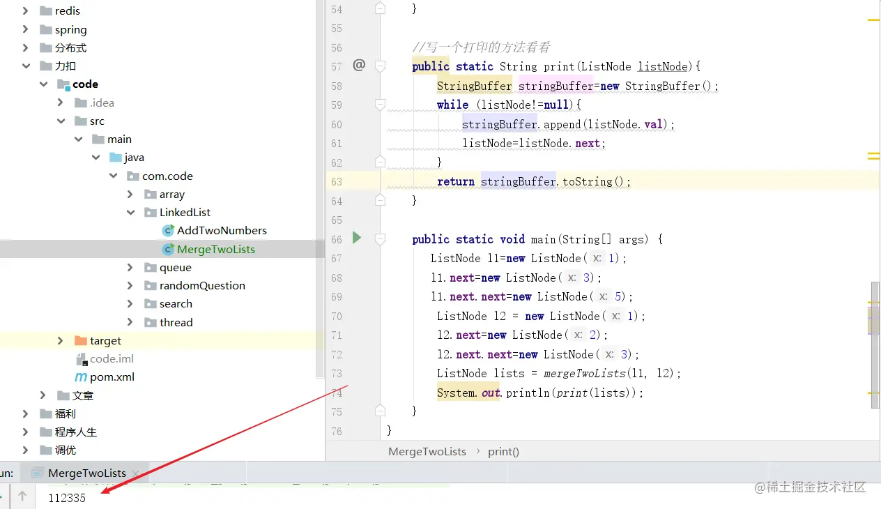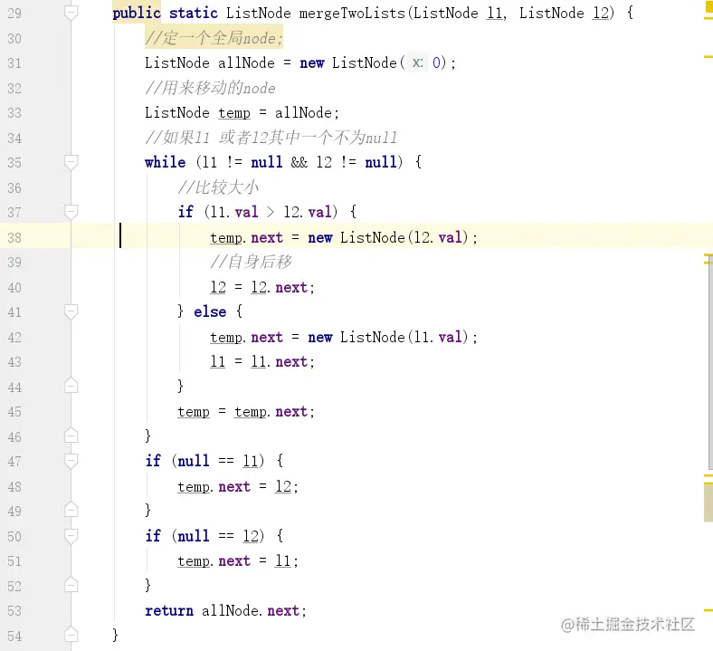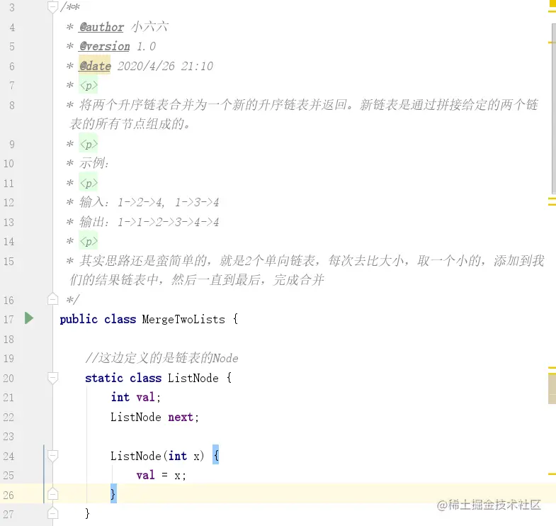 小六六带领大家来读读题,其实还是很简单的,就是2个单向链表嘛,我每次去比较这个链表,如果谁小,谁就添加到最后返回的那个链表上去,直到一个链表为null,说明就剩下另外一个,直接把另外一个的剩下的节点加入到那个我们需要返回的链表上去,结果就出来了嘛