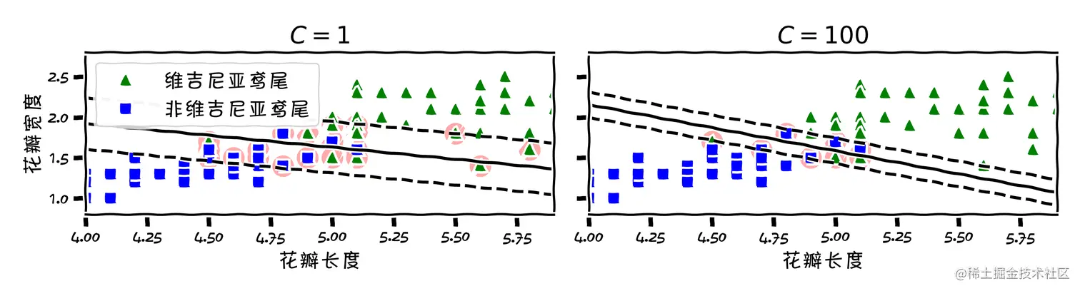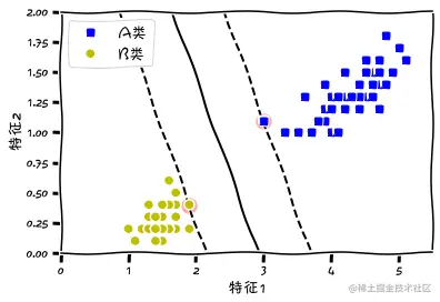 他在两个类之间找出一条很宽的街道(虚线之间),也因此叫做大间隔分类。当街道(虚线)之外的实例再怎么增加也不能够改变这个决策边界。请注意其中有两个圈出的实例,这两个位于街道边缘的实例起着决定街道大小的作用,因此也被称为支持向量。