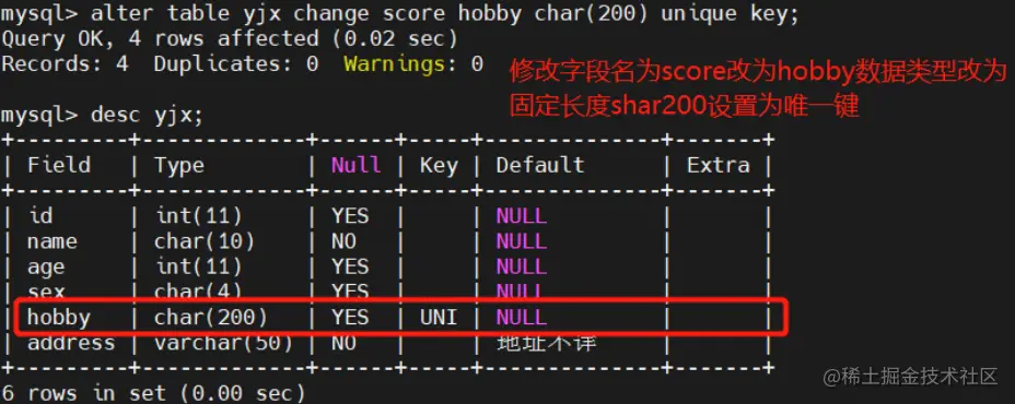 ALTER TABLE 表名 CHANGE 旧列名 新列名 数据类型 [unique key];