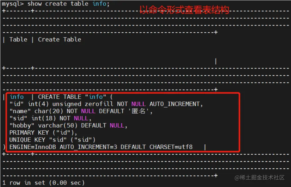 SHOW CREATE TABLE 表名;#以命令的形式查看表结构