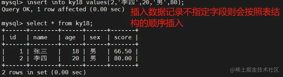 insert into 表名 values (字段1的值,字段2的值,.....);#不指定字段则会按照表结构的顺序插入数据