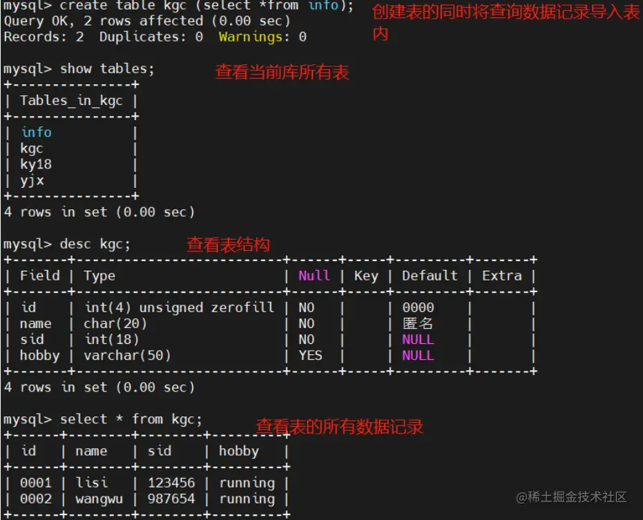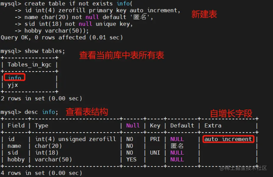 - if not exists:表示检测要创建的表是否已存在,如果不存在就继续创建