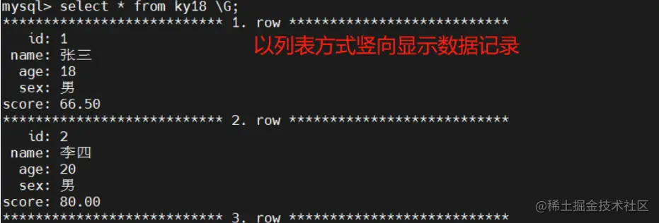 select * from 表名 \G; #以列表方式竖向显示数据记录