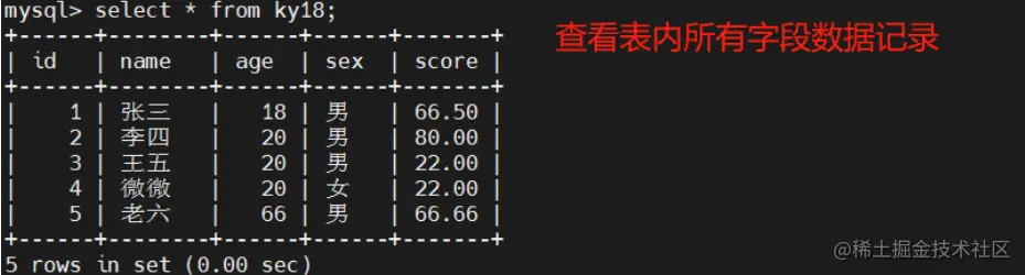 select * from 表名; #这里的*表示所有字段则会按照表结构的顺序显示