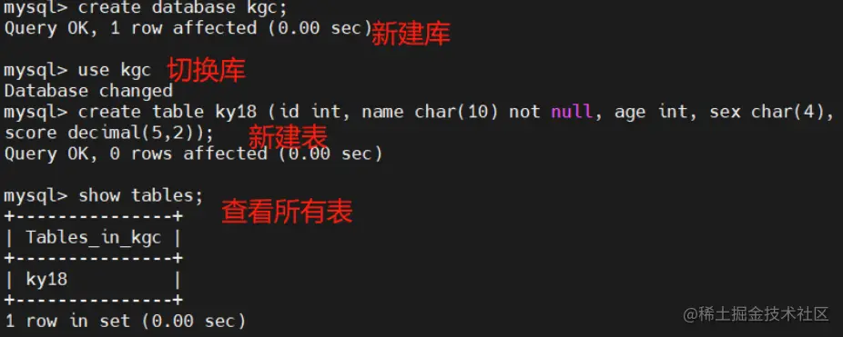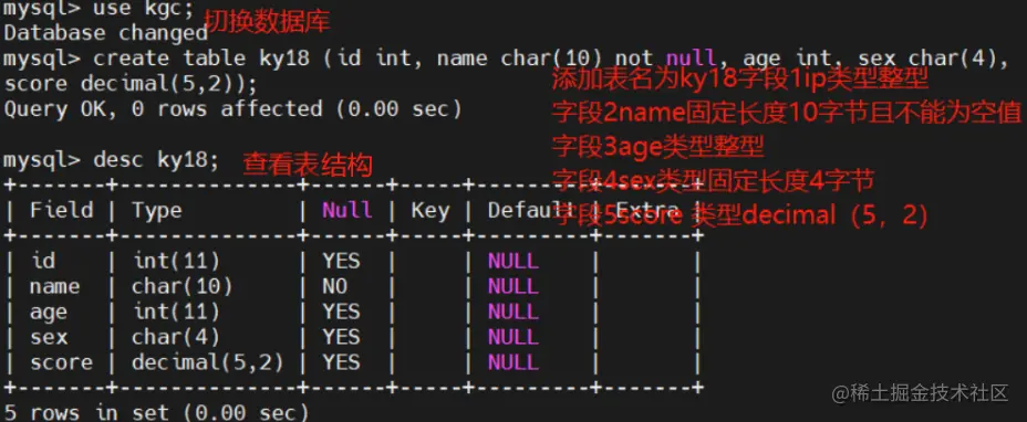 create table ky18 (id int, name char(10) not null, age int, sex char(4), score decimal(5,2));