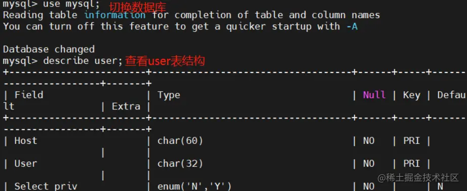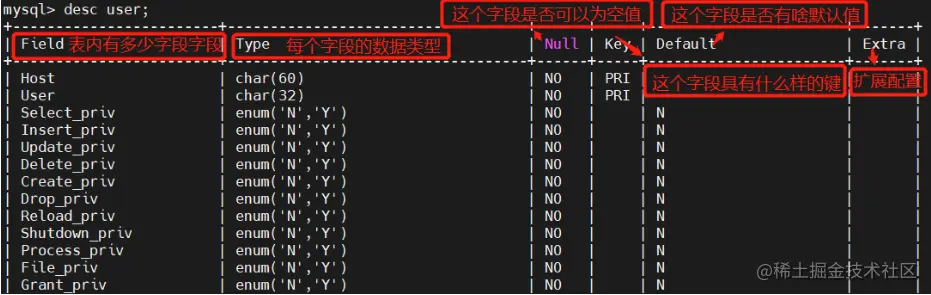 DESCRIBE 表名;
