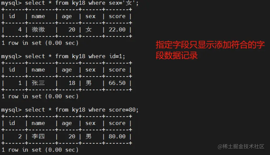 select 字段1,字段2.... from 表名 where 条件表达式; #只查看添加符合的字段数据记录
