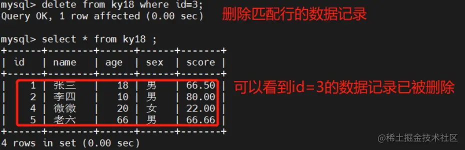 #DELETE清空表后,返回的结果内有删除的记录条目;DELETE工作时是一行一行的删除记录数据的;如果表中有自增长字段,使用DELETE FROM 删除所有记录后,再次新添加的记录会从原来最大的记录 ID 后面继续自增写入记录。