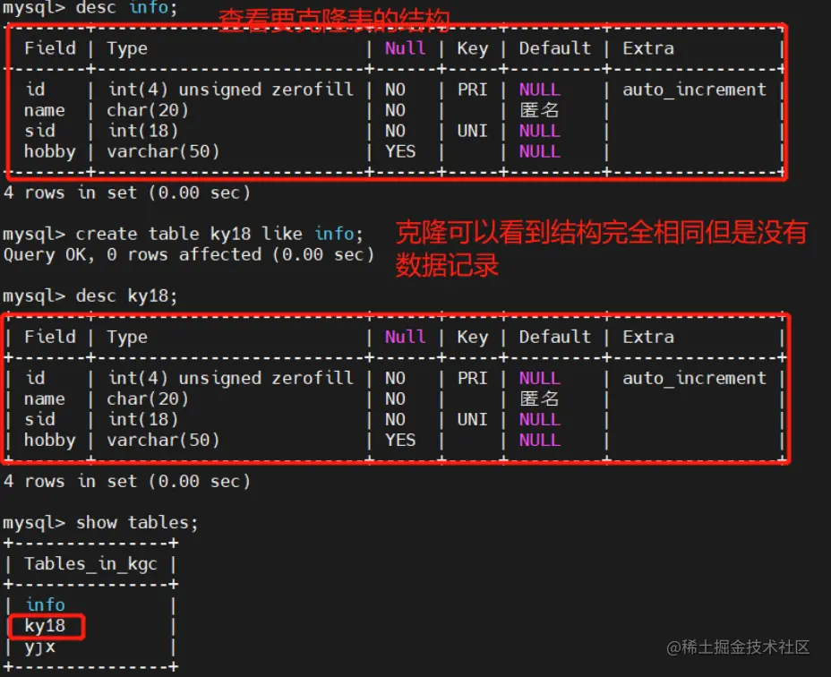 CREATE TABLE 新表名称 like 旧表名称; #克隆表的结构