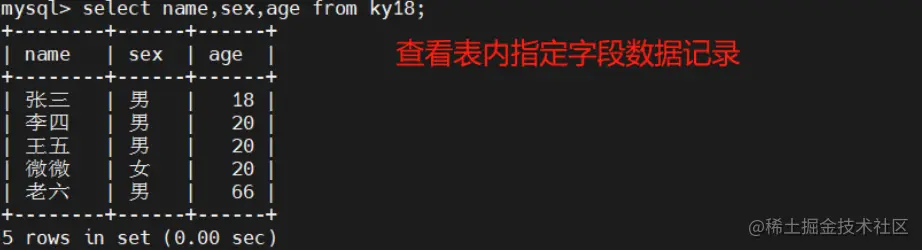select 字段1,字段2,.... from ky18; #如果指定字段不分前后顺序