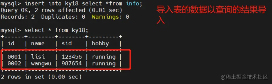 INSERT INTO 要导入数据记录的表名 SELECT * FROM 想要的数据表名;
