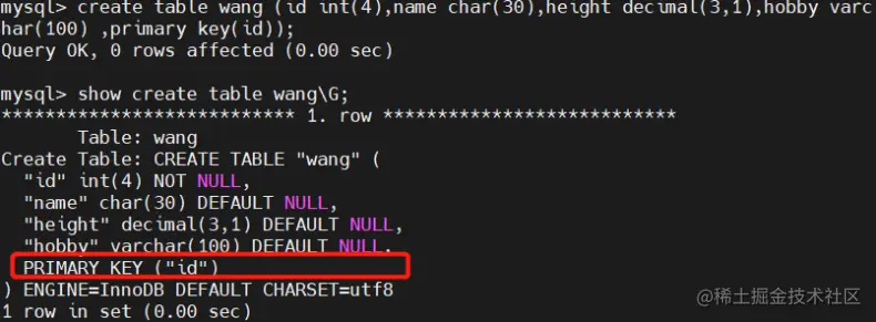 CREATE TABLE 表名 (字段1 数据类型,字段2 数据类型[,...], PRIMARY KEY (列名));