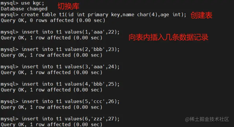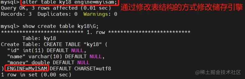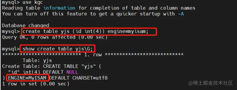 create table 表名(字段1数据类型,...)engine=MyISAM;