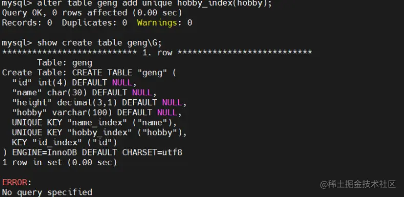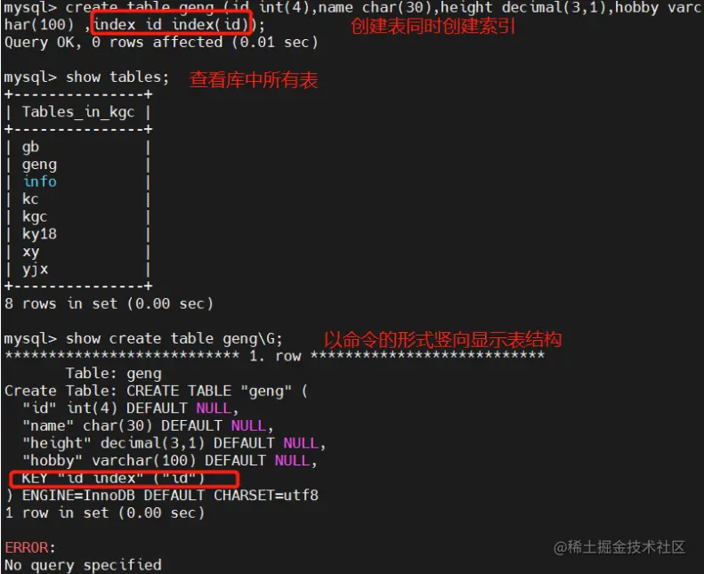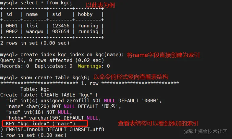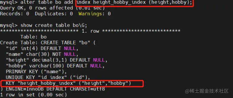 - (列名(length)):length是可选项,下同。如果忽略 length 的值,则使用整个列的值作为索引。如果指定使用列前的 length 个字符来创建索引,这样有利于减小索引文件的大小。