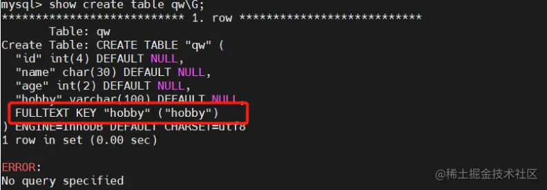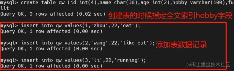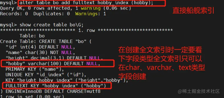 CREATE TABLE 表名 (字段1 数据类型[,...],FULLTEXT 索引名 (列名));
