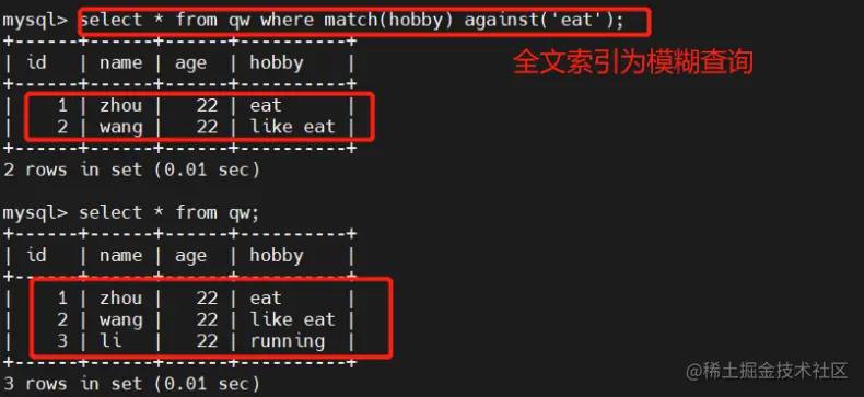 适合在进行模糊查的时候使用可用于在一篇文章中检索文本信息。在MySQL5.6版本以前FULLTEXT 索引仅可用于MyISAM引擎,在5.6版本之后innodb引擎也支持FULLTEXT索引。全文索引可以在CHAR、VARCHAR或者TEXT类型的列上创建。每个表只允许有一个全文索引。