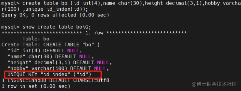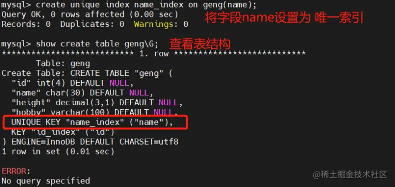 CREATE TABLE 表名 (字段1 数据类型,字段2 数据类型[,...],UNIQUE 索引名 (列名));