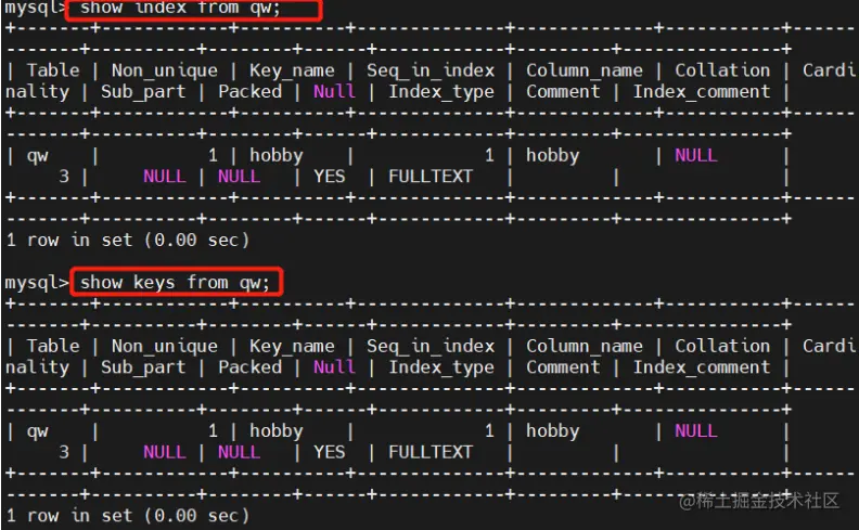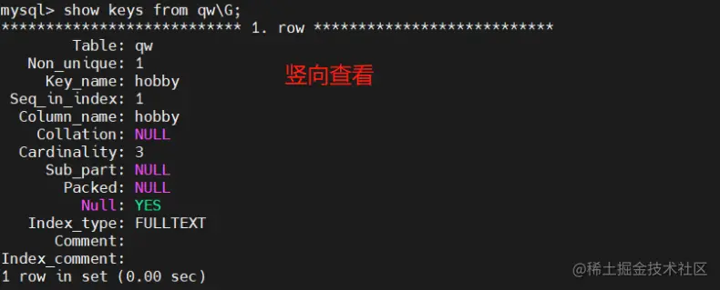 | sub_part | 如果列只是被部分地编入索引,则为被编入索引的字符的数目。如果整列被编入索引,则为NULL |