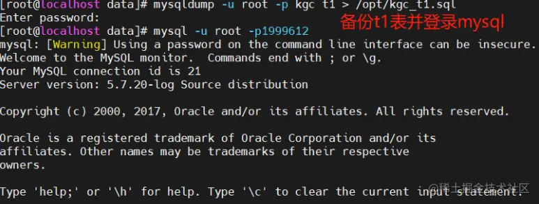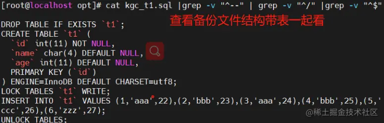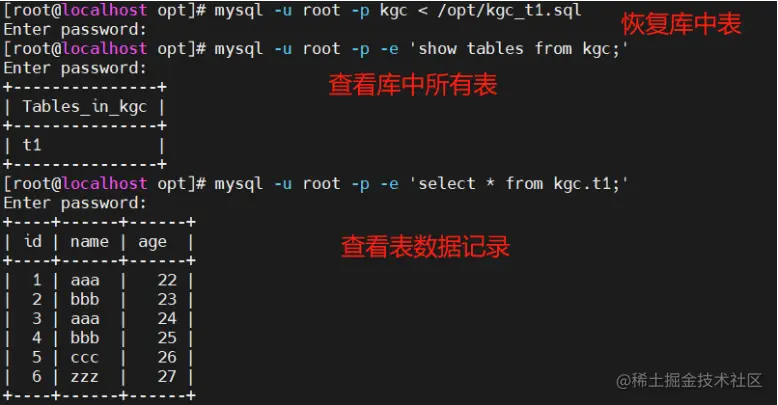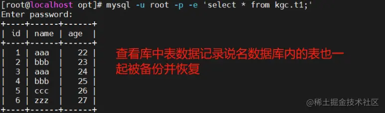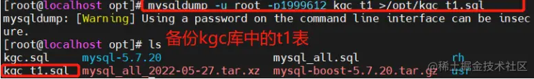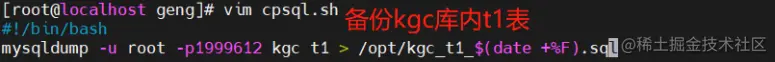 mysqldump -u root -p[密码] kgc t1 > /opt/kgc_t1_$(date +%F).sql #备份kgc库里的t1表(不建议直接将密码暴露出来最好写个脚本进行备份)