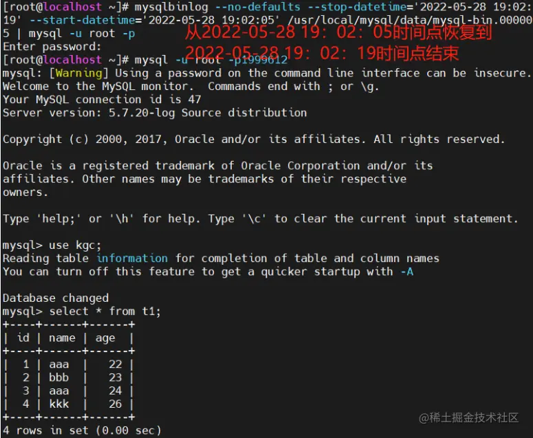 mysqlbinlog --no-defaults --start-datetime='时间点' 文件名 | mysql -u root -p