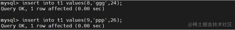 insert into t1 values(9,'ppp',26);