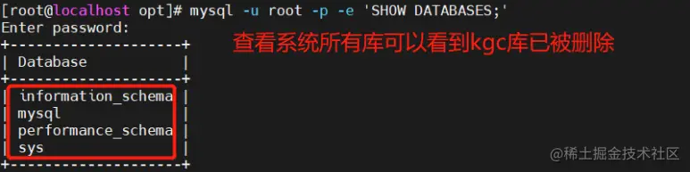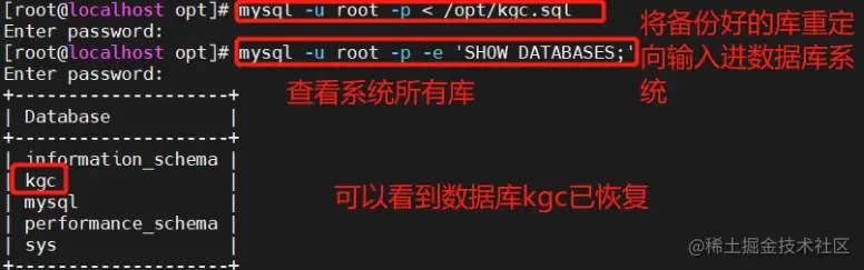 mysqldump -u root -p[密码] kgc > /opt/kgc_$(date +%F).sql #备份kgc库